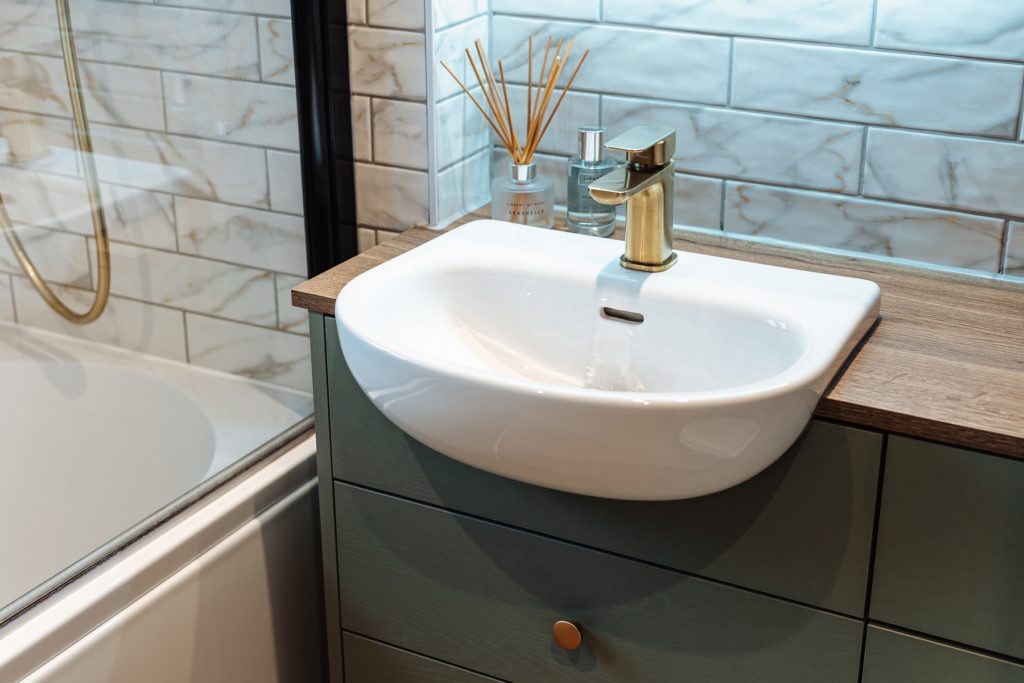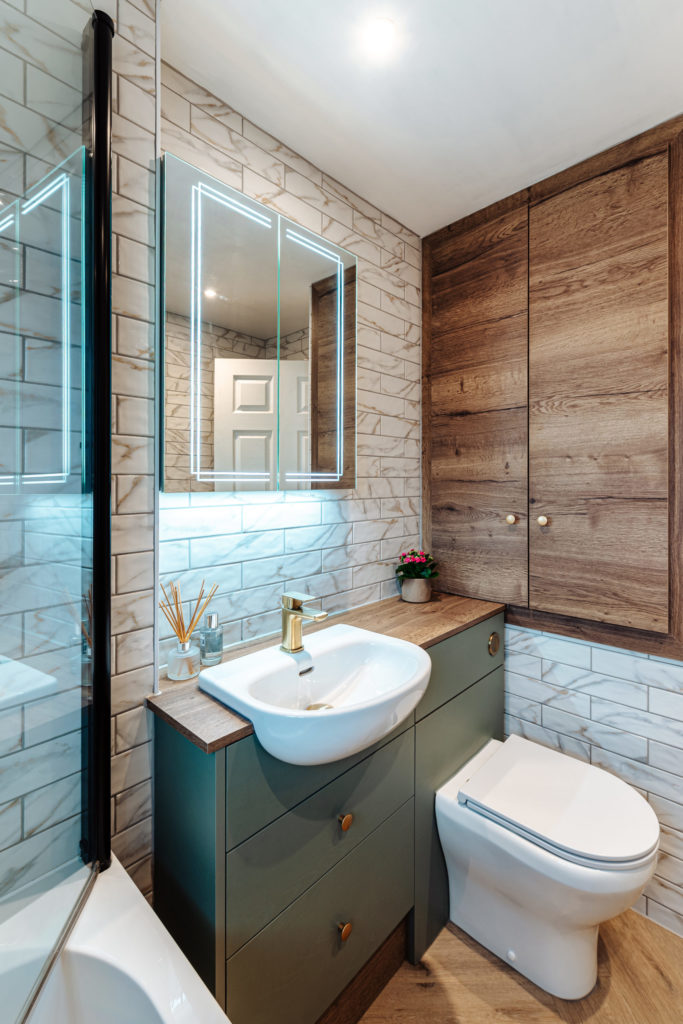 Location: Leek Designer: Allyson Lewis Collection: Roca Bathrooms Finish: Reed Green Woodgrain and Tobacco Haifax Oak Budget: Under £15k
