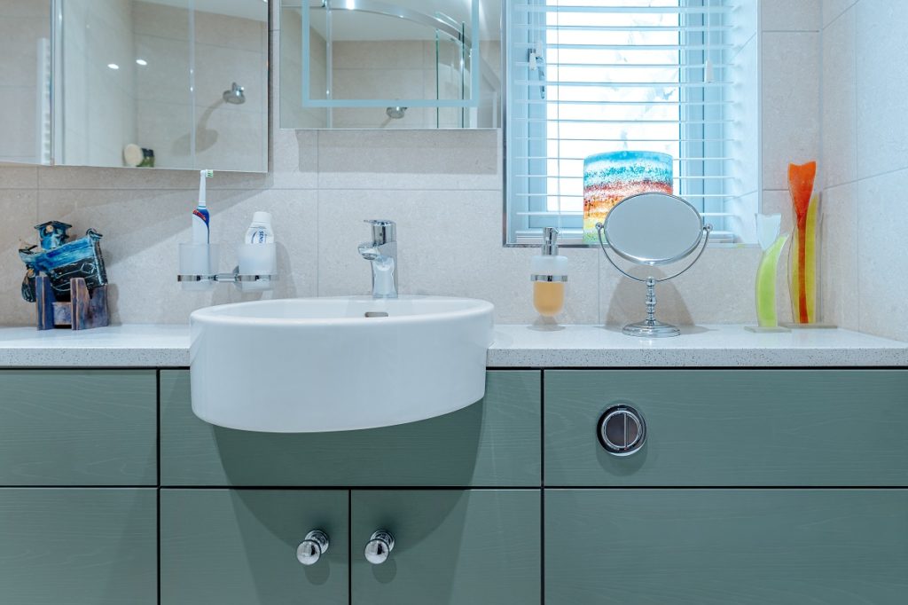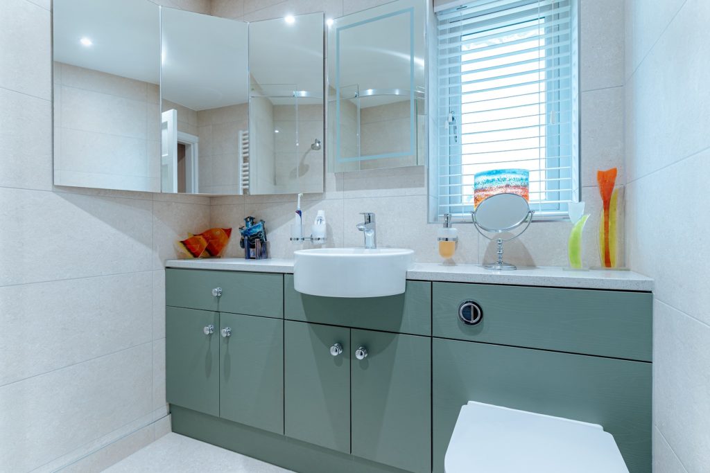 Location: Leek Designer: Allyson Lewis Collection: Roca Bathrooms Finish: Reed Green Woodgrain