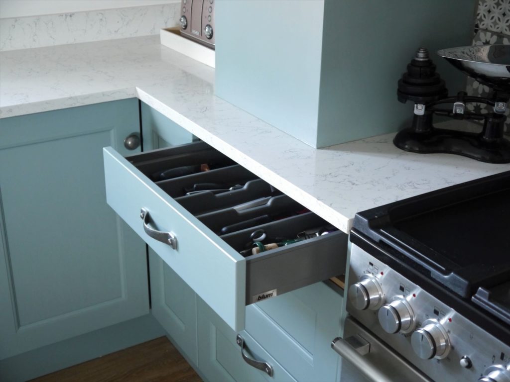 Location: Uttoxeter Designer: Allyson Lewis Collection: Caledonia Classic Kitchens Finish: Carrick Painted Summer Sky & Bardolino Oak Budget: £25 - £40K