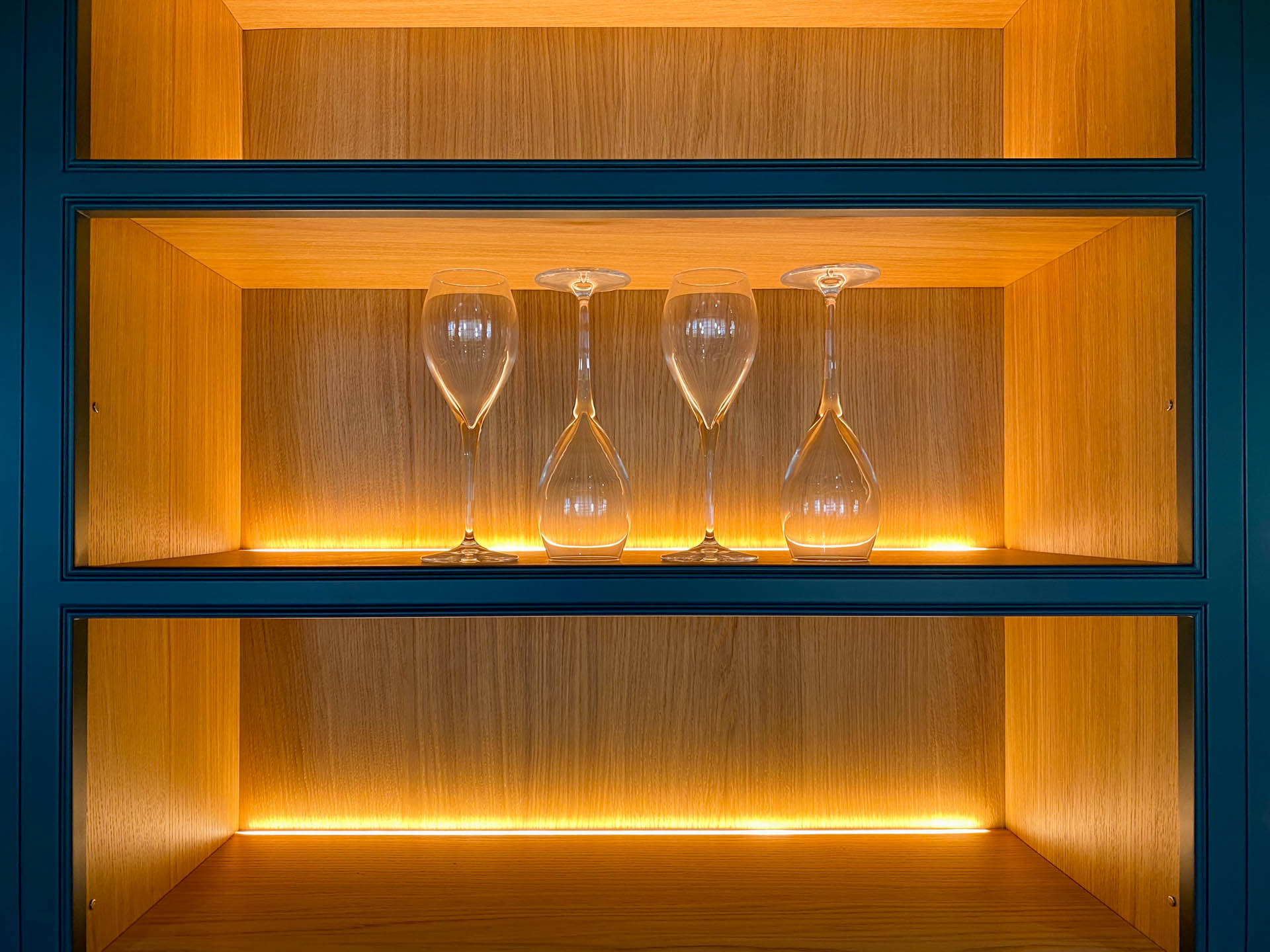 For a sleek, integrated look, consider our strip lighting. These lights can be routed into the shelf or gables of your units, maintaining a flush finish. Available in the same three adjustable light temperature options, they offer the same remote and Alexa control.